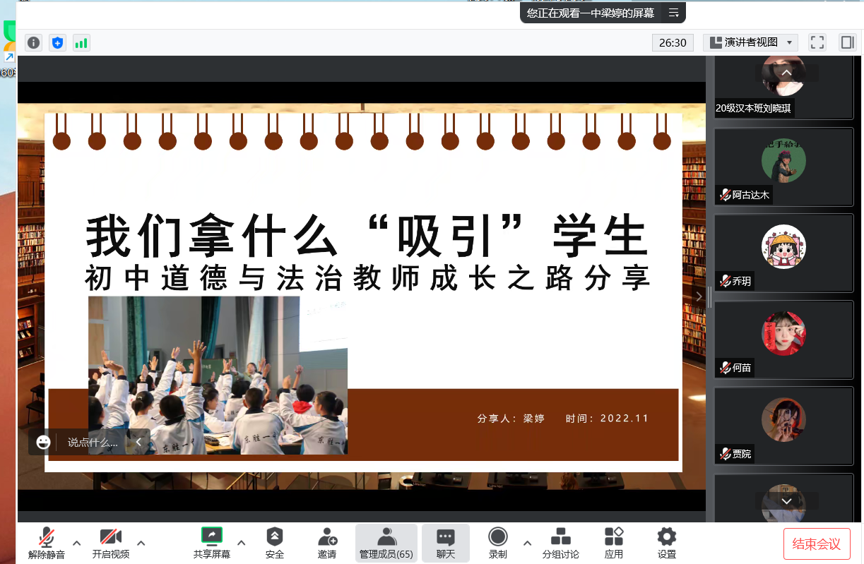 为了更好适应教育部师范类专业认证的新要求,进一步加强专业建设,11月5日,外围买球的app十大平台组织开展“中学政治教师素质养成”系列讲座的第二讲,邀请到鄂尔多斯市东胜区第一中学梁婷老师为学院学生作“初中道德与法治教师成长之路分享”线上主题讲座。讲座由学院吴娇老师主持,学院全体学生在线参加。