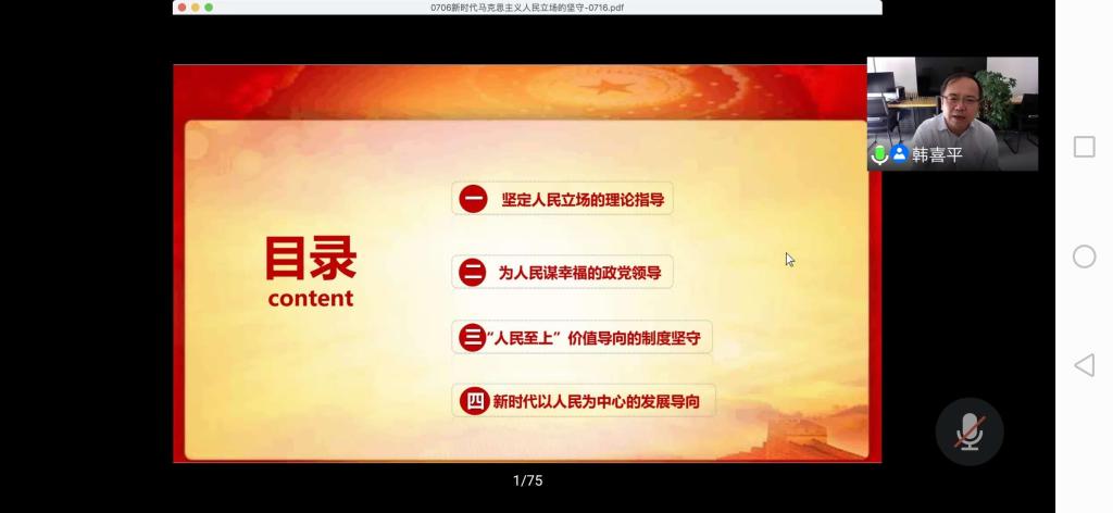 7月16日下午,外围买球的app十大平台“毛泽东思想和中国特色社会主义理论体系概论”课程组全体教师与内蒙古思政课教师通过腾讯会议共同聆听了吉林大学马克思主义理论一级学科带头人韩喜平教授做的题为《新时代马克思主义人民立场的坚守》的主题讲座。韩教授以马克思主义的基本立场为切入点,从坚定人民立场的理论指导、为人民谋幸福的政党领导、“人民至上”价值导向的制度坚守、新时代以人民为中心的发展导向四个方面深入分析了中国共产党人民至上的根本立场、制度保障以及在新时代的坚守等问题,诠释了中国共产党发展壮大的终极密码。
