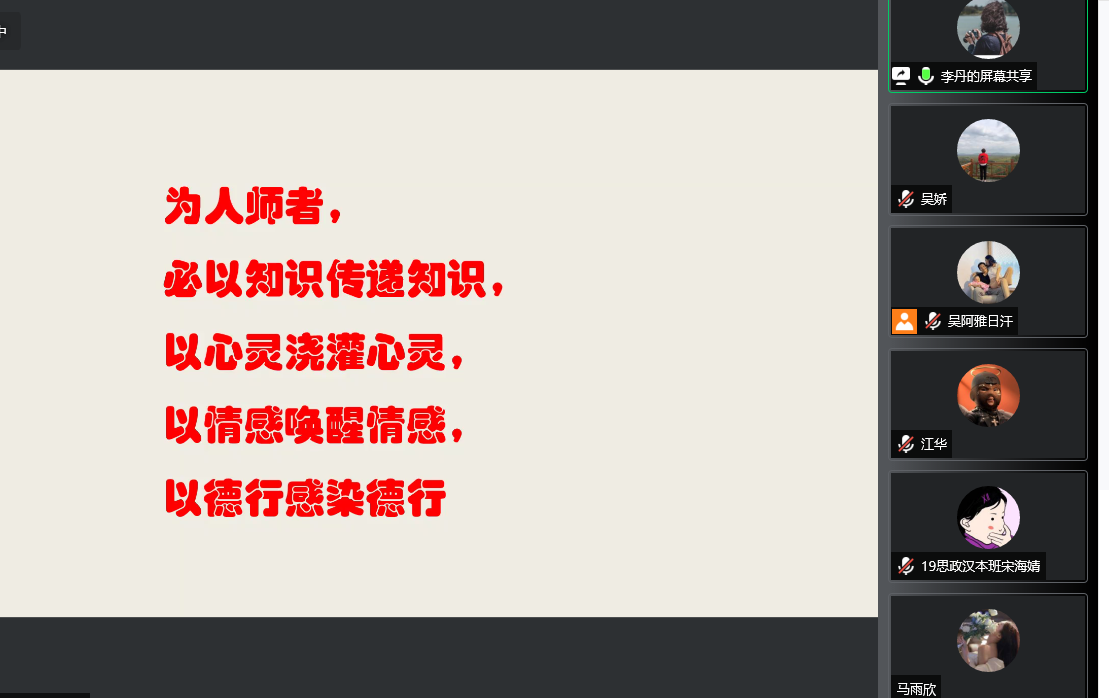 讲座中,李丹老师结合高中《读本》进行教学设计,从教材、学情、教学目标、教学过程、教学重难点、教学方法与手段及教学反思等几个方面进行了全面的讲解。讲座结束后,李丹老师针对高中教学中常见问题与学生进行了互动交流。随后,在线的200余名学生也对高中思政课教学中的问题、难点和疑惑向李丹老师进行了提问,教研活动在轻松愉悦的氛围中结束。