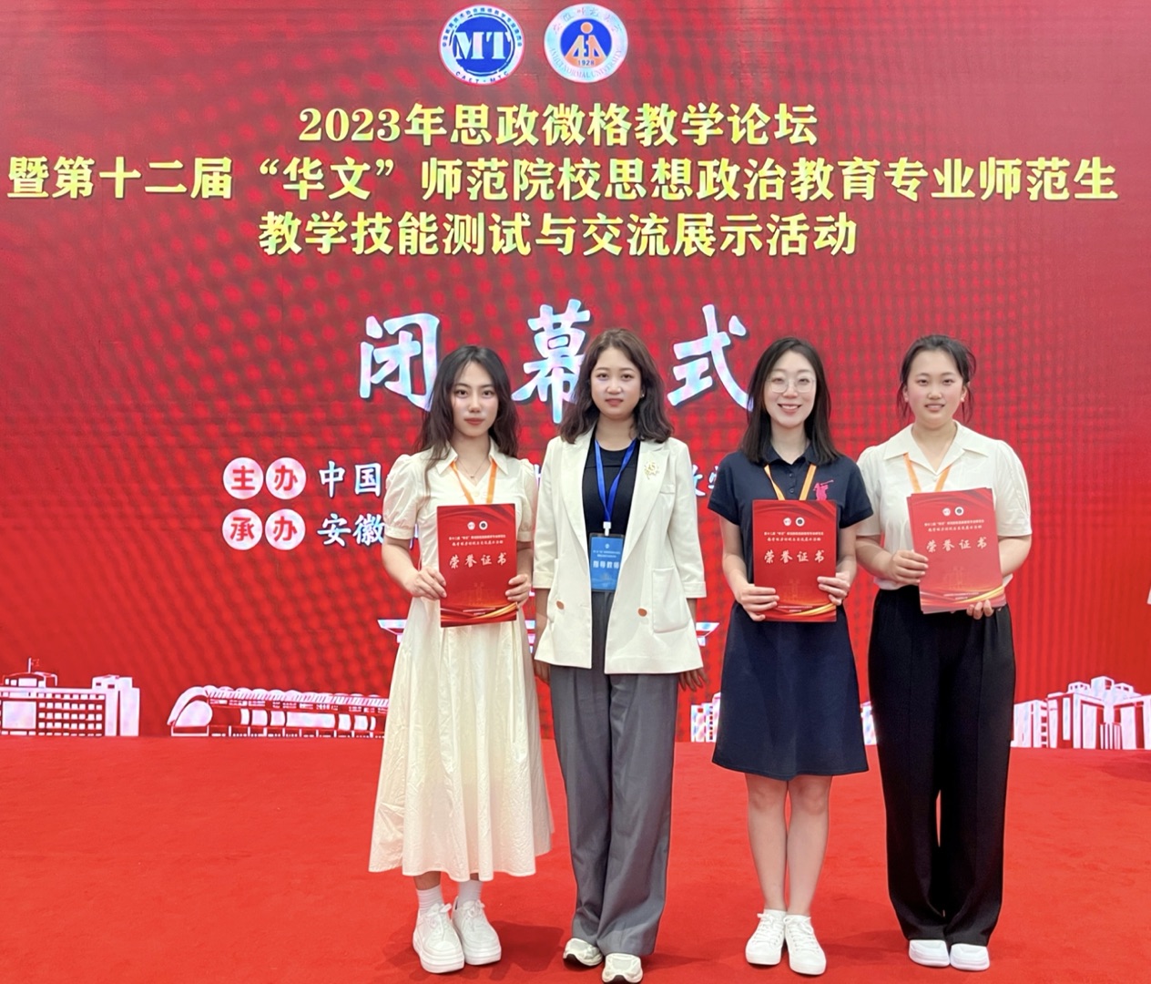 6月2日—5日,第十二届“华文”全国师范院校思想政治教育专业师范生教学技能测试与交流展示活动在安徽芜湖隆重举行。本次活动由中国教育技术协会微格教学专业委员会主办、安徽师范大学承办,是目前国内教育专业规模最大、参与高校最多、影响最广的师范生教学技能比赛之一。本次比赛共有83所师范院校,650名师生参加,我院由杨萨茹拉老师带队,薛芮、杨棐絮、刘欣悦等3名学生参加。