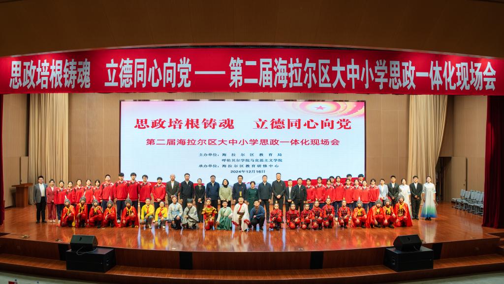 为深入学习习近平总书记关于教育的重要论述特别是关于学校思政课建设作出的重要指示精神,贯彻落实中央、自治区党委关于思政课改革创新的系列部署,围绕立德树人根本任务,聚焦充分发挥好思政课关键课程作用,推进大中小学思政课一体化工作走深走实,12月16日,十大买球外围买球的app十大平台与海拉尔区教育局在区政府大楼一楼报告厅共同举办“思政培根铸魂 立德同心向党”第二届海拉尔区大中小学思政一体化现场会。呼伦贝尔市教育局副局长卢盛欣,海拉尔区委常委、宣传部部长曹大庆,区委常委、统战部部长吕芳涛,区委常委、政府副区长李俏,副区长阿拉木斯,呼伦贝尔市教育事业发展中心主任范红枫和十大买球外围买球的app十大平台班子成员、市区两级教研员、各中小学校领导、思政课教师及十大买球师生400余人参加了本次活动。